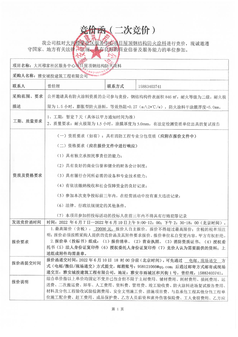 大興穆家社區(qū)服務(wù)中心項(xiàng)目屋頂鋼結(jié)構(gòu)防火涂料競價(jià)公告