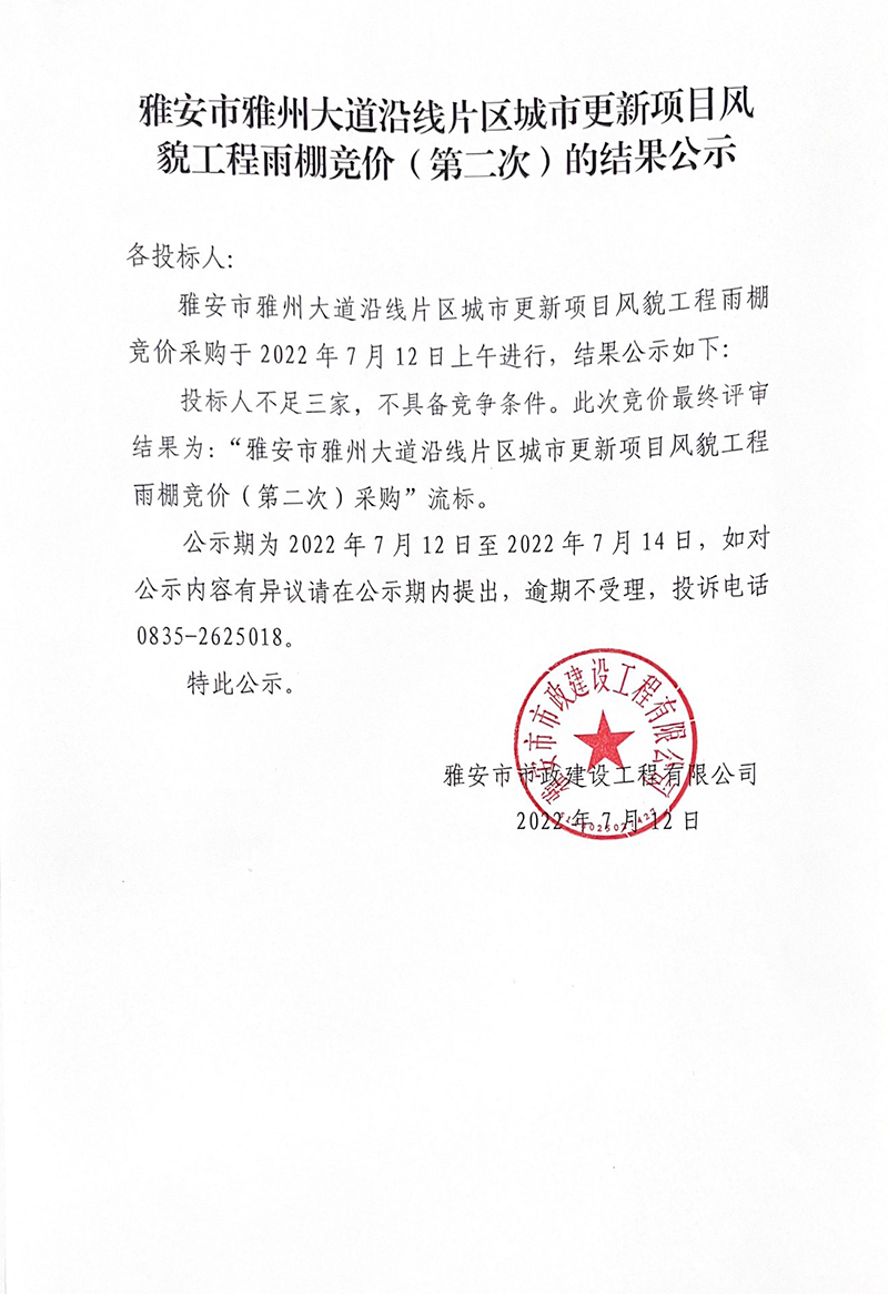 雅安市雅州大道沿線片區(qū)城市更新項目風貌工程雨棚競價(第二次)的結果公示