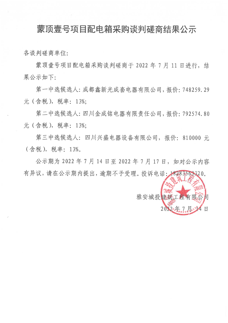 蒙頂壹號項(xiàng)目配電箱采購談判磋商結(jié)果公示