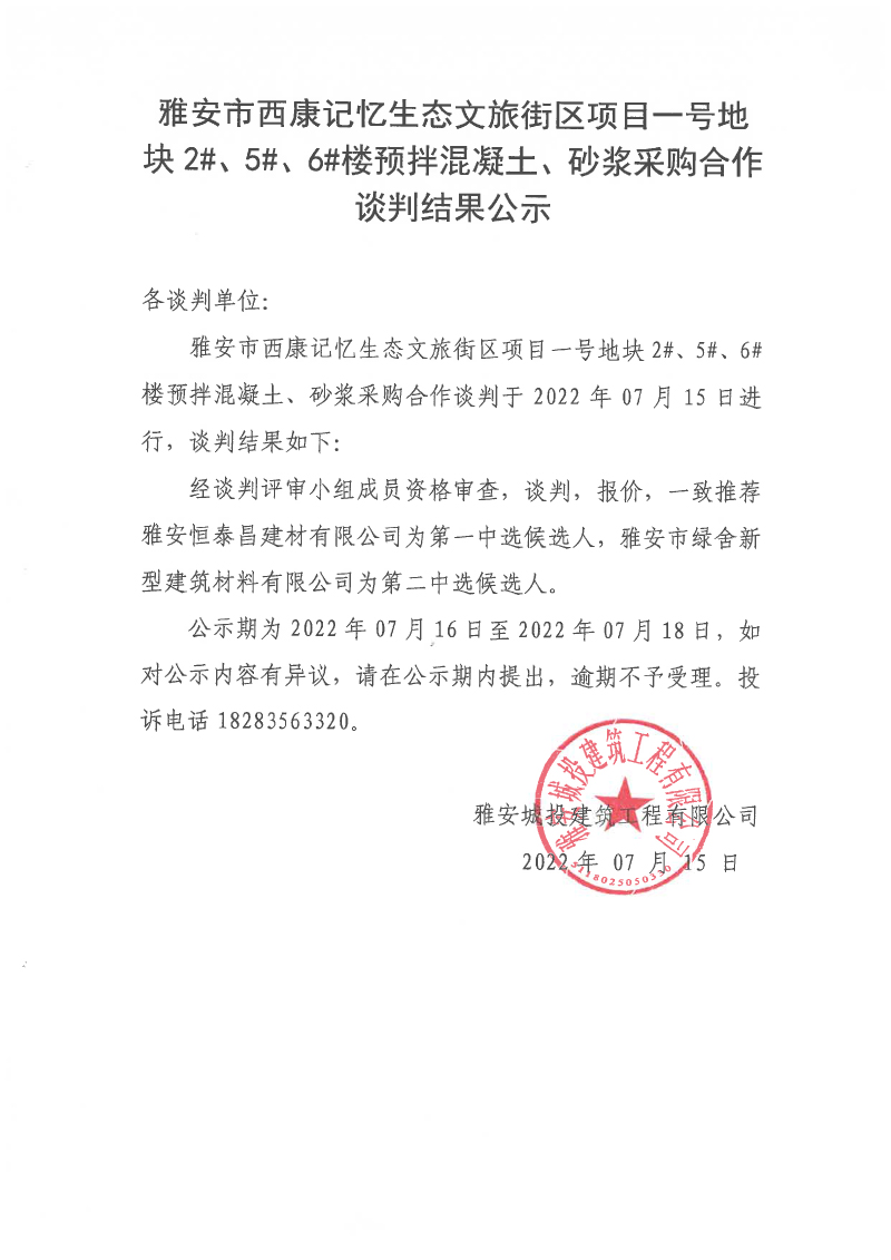 雅安市西康記憶生態(tài)文旅街區(qū)項目一號地塊2#、5#、6#樓預拌混凝土、砂漿采購合作談判結(jié)果公示