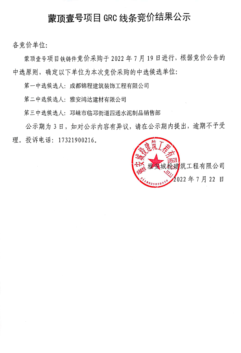 蒙頂壹號(hào)項(xiàng)目GRC線條競(jìng)價(jià)結(jié)果公示