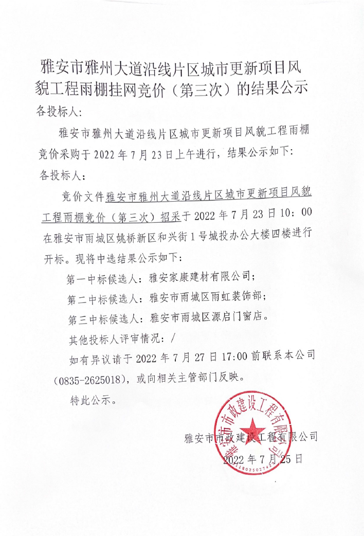 雅安市雅州大道沿線片區(qū)城市更新項(xiàng)目風(fēng)貌工程雨棚競價(jià)(第三次)的結(jié)果公示