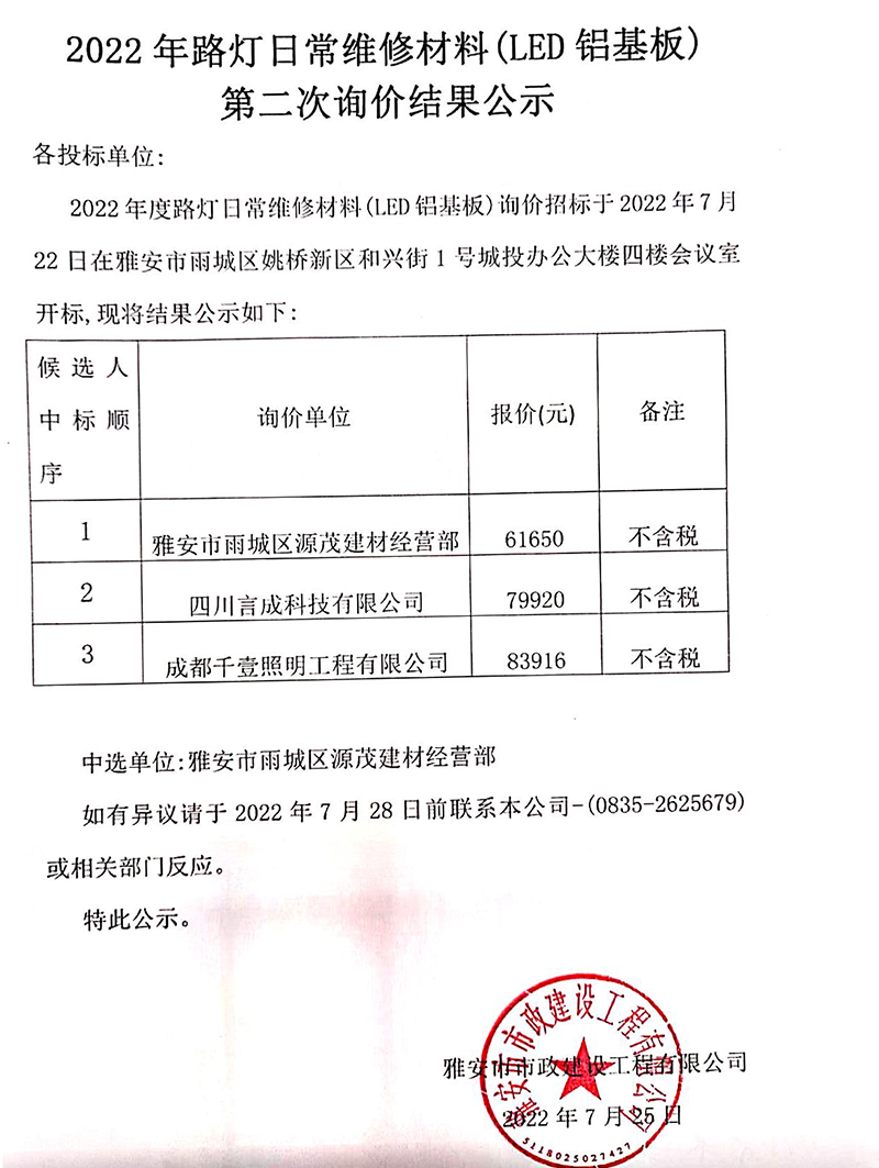 2022年路燈日常維修材料(LED鋁基板)第二次詢價(jià)結(jié)果公示
