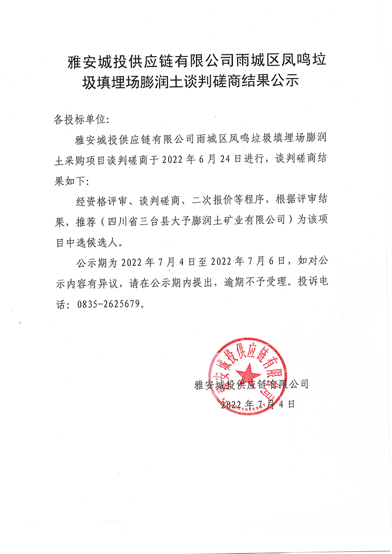 雅安城投供應(yīng)鏈有限公司雨城區(qū)鳳鳴垃圾填埋場(chǎng)封場(chǎng)永久性治理工程項(xiàng)目鈉基膨潤(rùn)土談判磋商結(jié)果公示