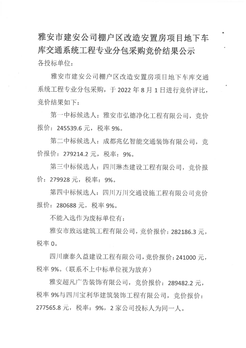 雅安市建安公司棚戶區(qū)改造安置房項(xiàng)目地下車庫(kù)交通系統(tǒng)工程專業(yè)分包競(jìng)價(jià)結(jié)果公示