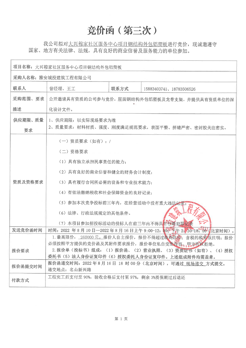 大興穆家社區(qū)服務(wù)中心項(xiàng)目鋼結(jié)構(gòu)外包鋁塑板競價(jià)公告(第三次)