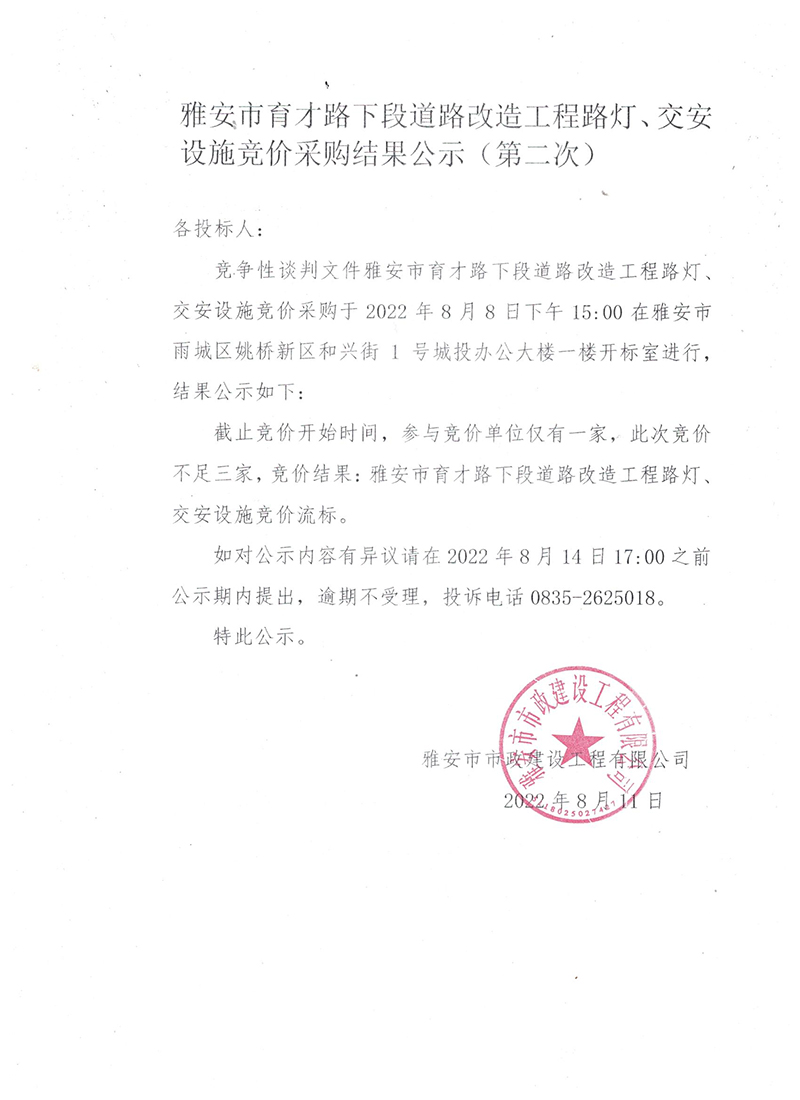 雅安市育才路下段道路改造工程路燈、交安設(shè)施競(jìng)價(jià)采購(gòu)結(jié)果公示(第二次)