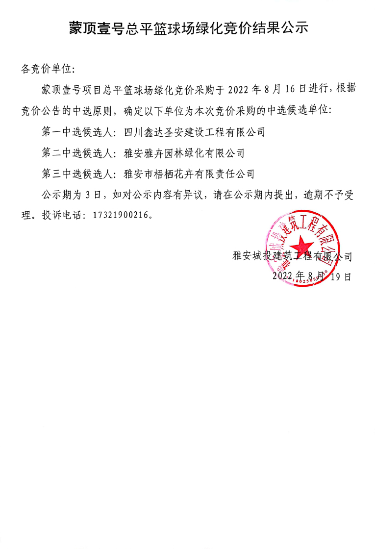 蒙頂壹號項(xiàng)目總平籃球場綠化競價結(jié)果公示