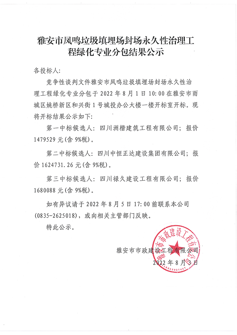 雅安市鳳鳴垃圾填埋場封場永久性治理工程項(xiàng)目綠化專業(yè)分包結(jié)果公示