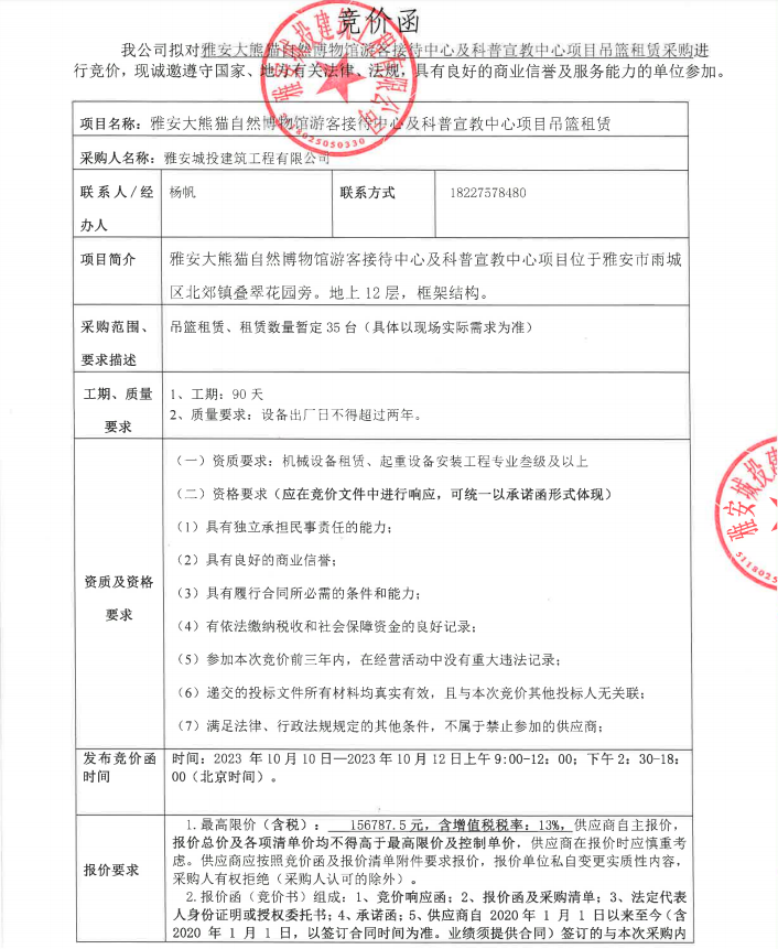 雅安大熊貓自然博物館游客接待中心及科普宣教中心項(xiàng)目吊籃租賃采購(gòu)競(jìng)價(jià)公告