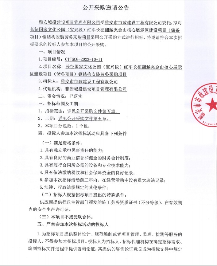長征國家文化公園(寶興段)紅軍長征翻越夾金山核心展示區(qū)建設(shè)項目(儲備項目)鋼結(jié)構(gòu)安裝勞務(wù)采購項目公開采購邀請公告