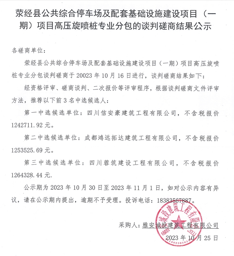 滎經(jīng)縣公共綜合停車場及配套基礎(chǔ)設(shè)施建設(shè)項目(一期)項目高壓旋噴樁專業(yè)分包的談判磋商結(jié)果公示