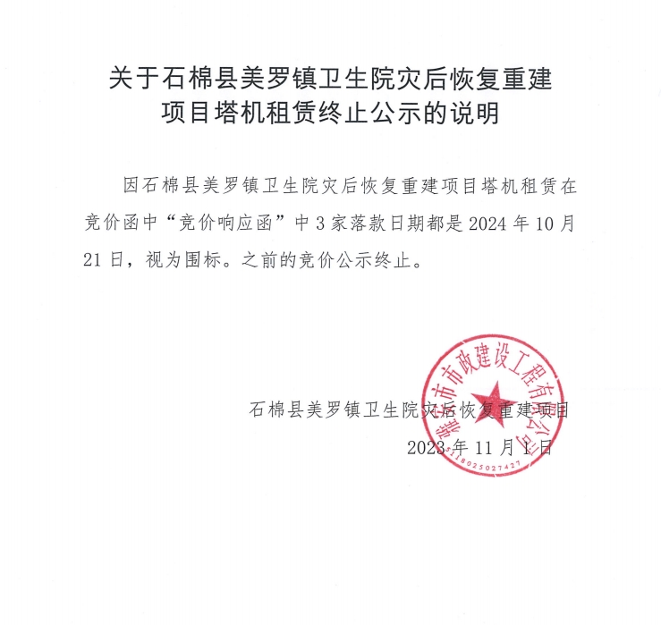 關(guān)于石棉縣美羅鎮(zhèn)衛(wèi)生院災(zāi)后恢復(fù)重建項目塔機租賃終止公示的說明