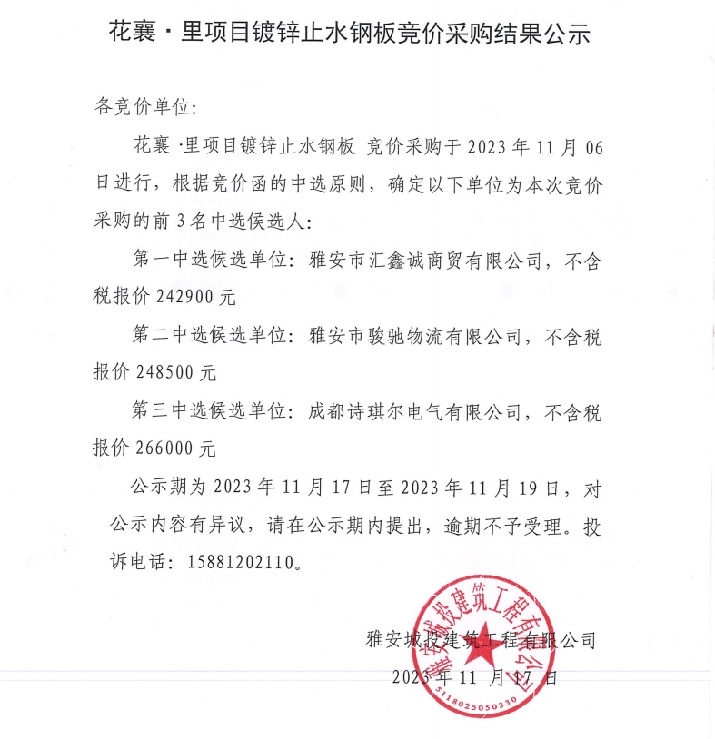 花襄·里項目鍍鋅止水鋼板競價采購結果公示