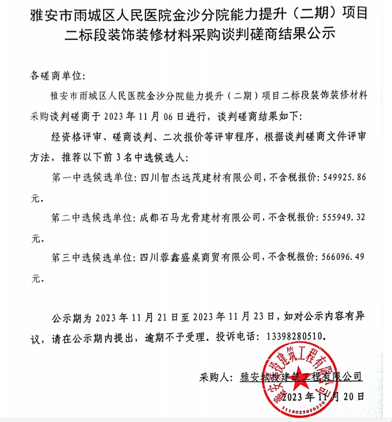 雅安市雨城區(qū)人民醫(yī)院金沙分院能力提升(二期)項目二標(biāo)段裝飾裝修材料采購談判磋商結(jié)果公示