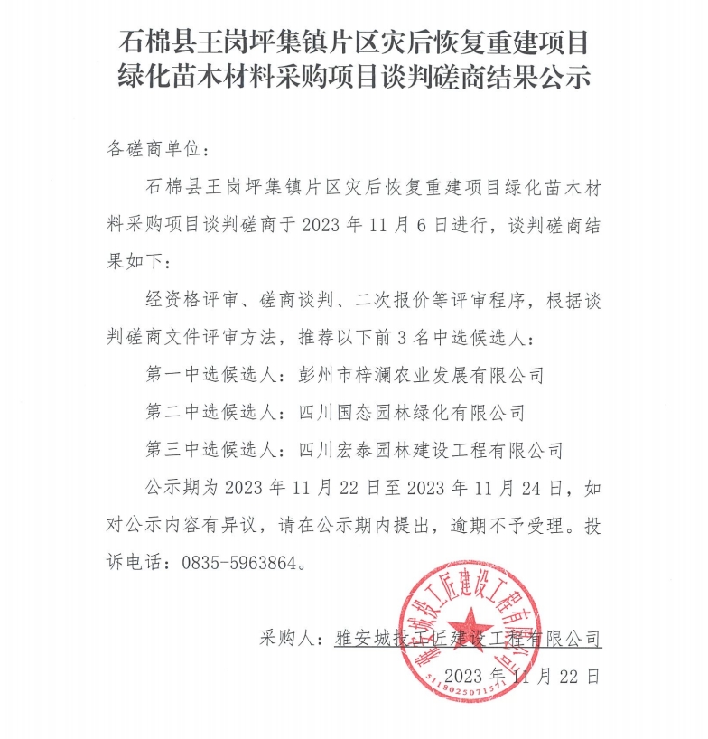 石棉縣王崗坪集鎮(zhèn)片區(qū)災后恢復重建項目綠化苗木材料采購項目談判磋商結果公示