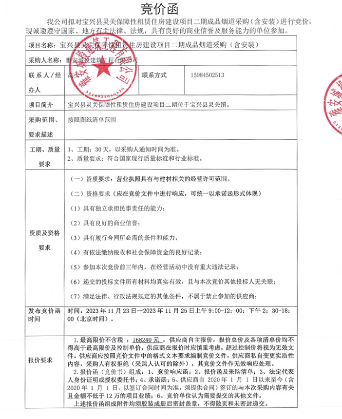 寶興縣靈關(guān)保障性租賃住房建設(shè)項(xiàng)目二期成品煙道采購(含安裝)競價公告