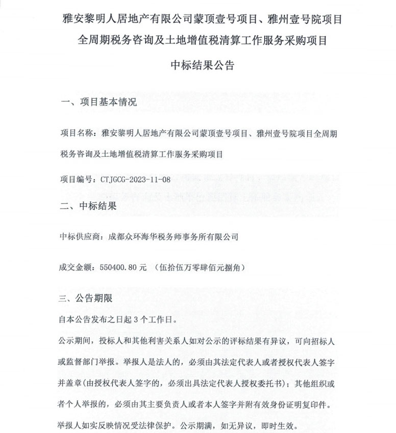 雅安黎明人居地產(chǎn)有限公司蒙頂壹號(hào)項(xiàng)目、雅州壹號(hào)院項(xiàng)目全周期稅務(wù)咨詢及土地增值稅清算工作服務(wù)采購(gòu)項(xiàng)目中標(biāo)結(jié)果公告