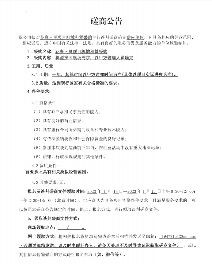 花襄·里項(xiàng)目機(jī)械租賃采購(gòu)談判磋商公告