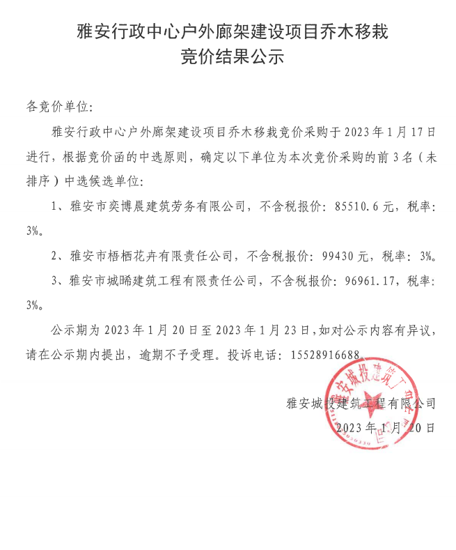 雅安行政中心戶外廊架建設項目喬木移栽競價結果公示