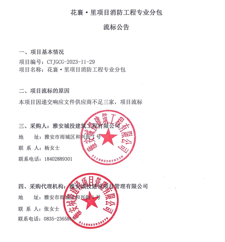 花襄·里項(xiàng)目消防工程專業(yè)分包流標(biāo)公告