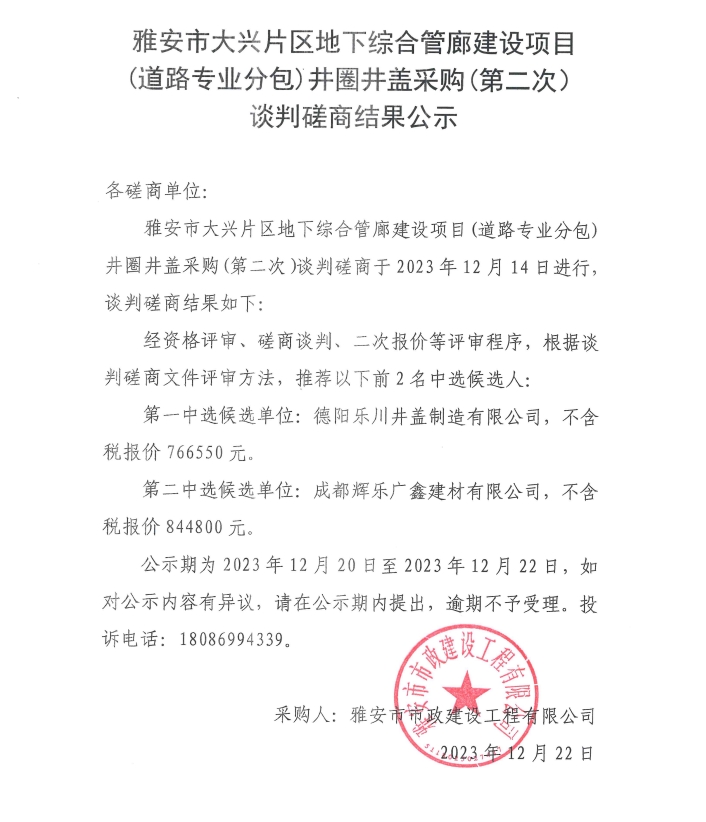雅安市大興片區(qū)地下綜合管廊建設項目(道路專業(yè)分包)井圈井蓋采購(第二次)談判磋商結果公示
