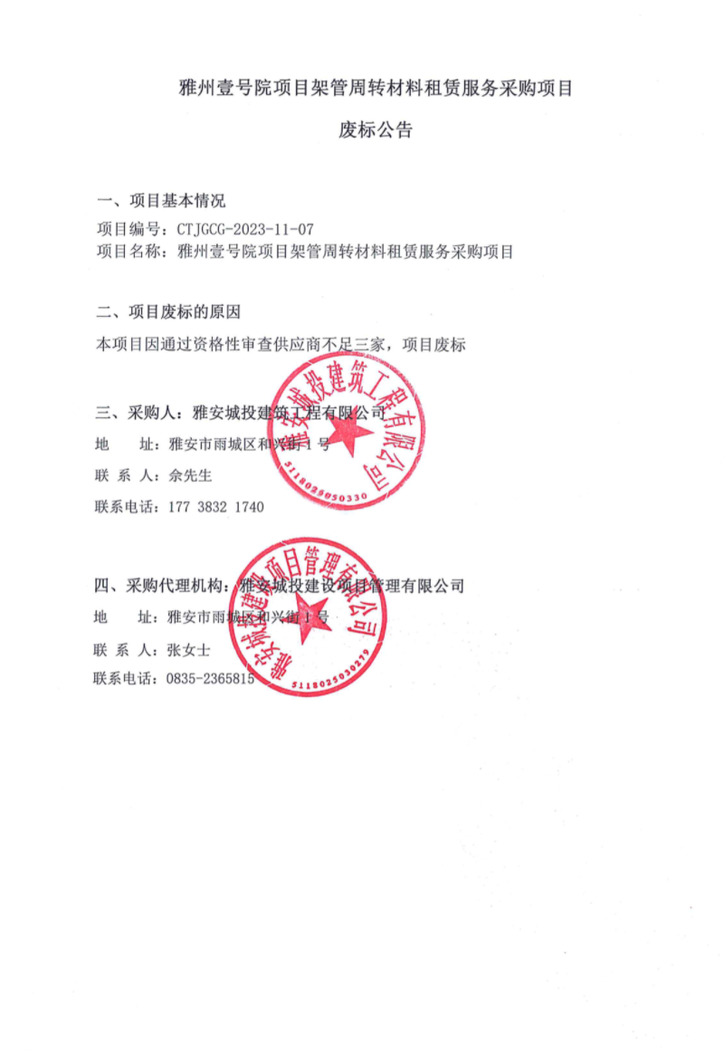 雅州壹號(hào)項(xiàng)目架管周轉(zhuǎn)材料租賃服務(wù)采購(gòu)項(xiàng)目廢標(biāo)公告