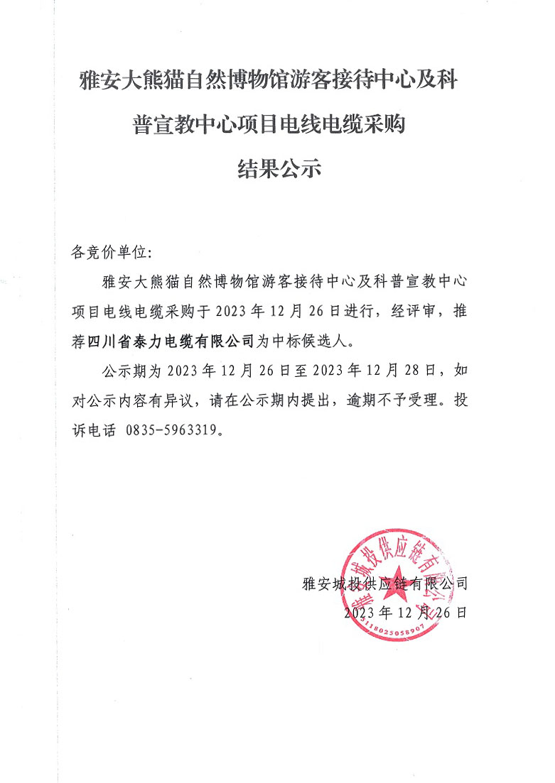 雅安大熊貓自然博物館游客接待中心及科普宣教中心項(xiàng)目電線電纜采購(gòu)結(jié)果公示