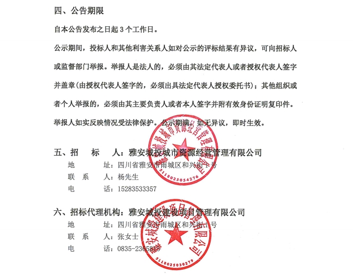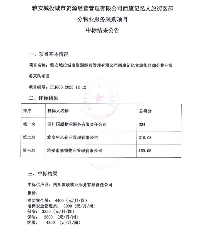 雅安城投城市資源經(jīng)營管理有限公司西康記憶文旅街區(qū)部分物業(yè)服務(wù)采購項目中標(biāo)結(jié)果公告
