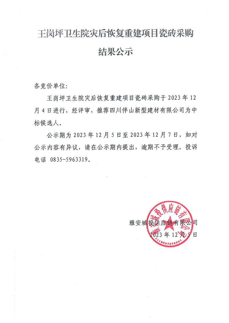 王崗坪衛(wèi)生院災(zāi)后恢復(fù)重建項目瓷磚采購結(jié)果公示