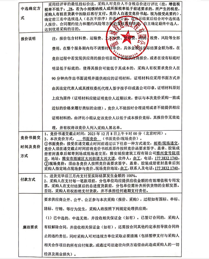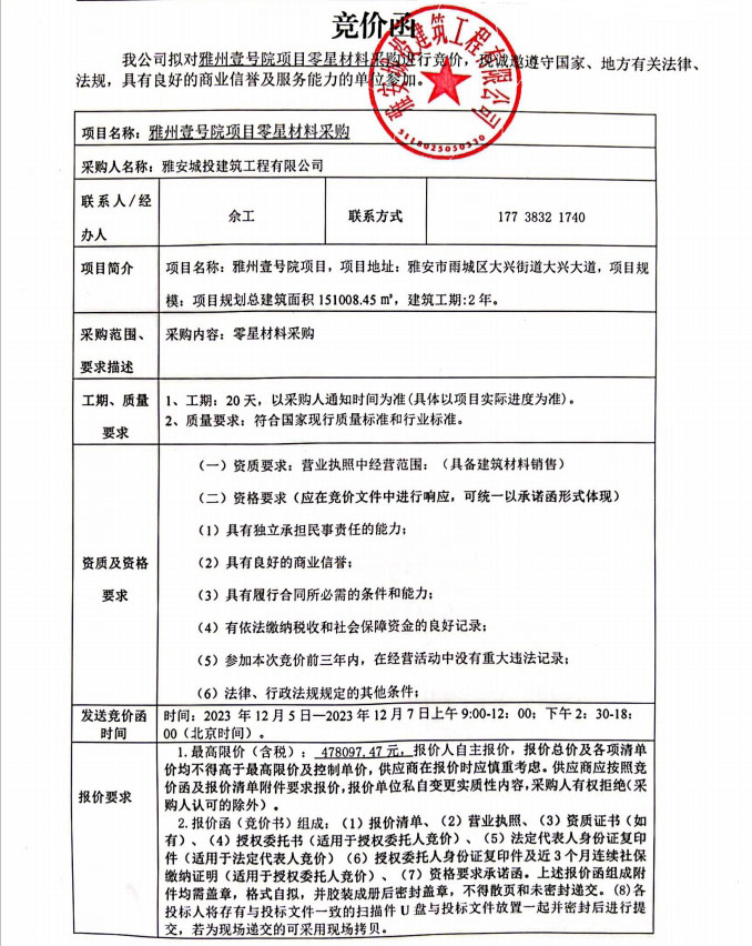 雅州壹號院項(xiàng)目零星材料采購競價公告