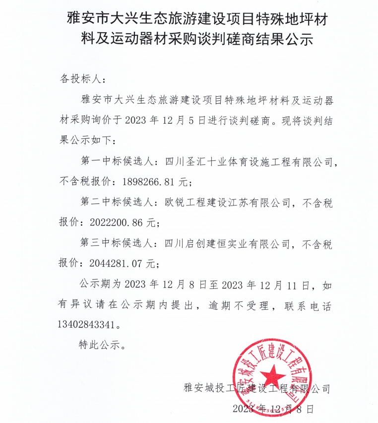 雅安市大興生態(tài)旅游建設(shè)項(xiàng)目特殊地坪材料及運(yùn)動(dòng)器材采購(gòu)談判磋商結(jié)果公示