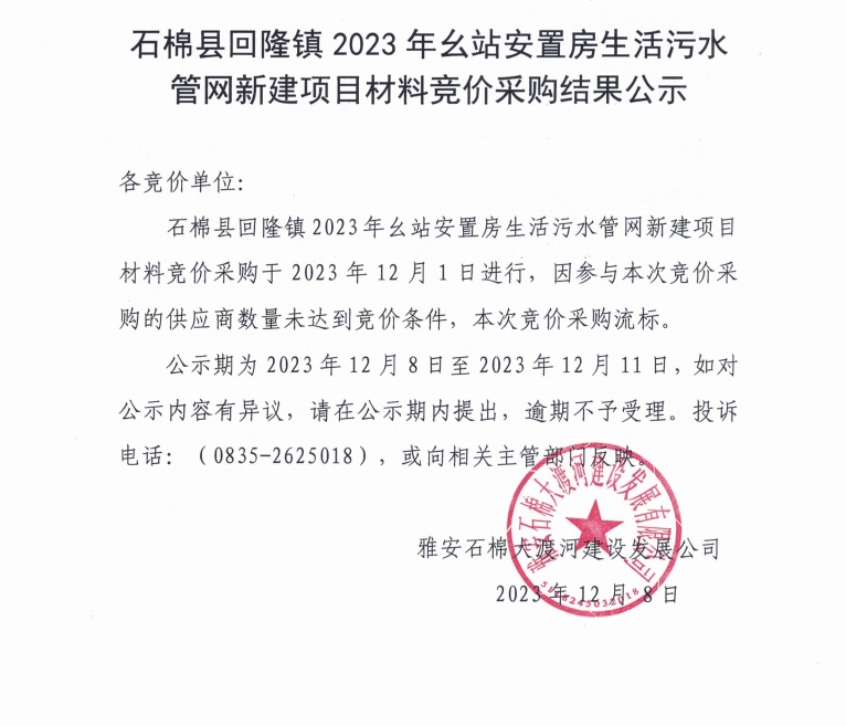 石棉縣回隆鎮(zhèn)2023年幺站安置房生活污水管網(wǎng)新建項(xiàng)目材料競(jìng)價(jià)采購結(jié)果公示
