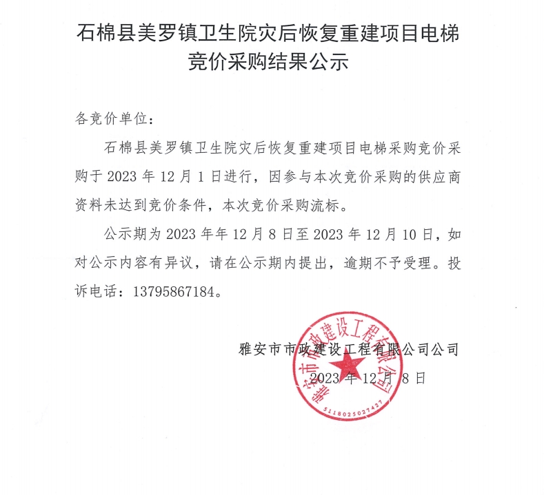 石棉縣美羅鎮(zhèn)衛(wèi)生院災后恢復重建項目電梯競價采購結(jié)果公示