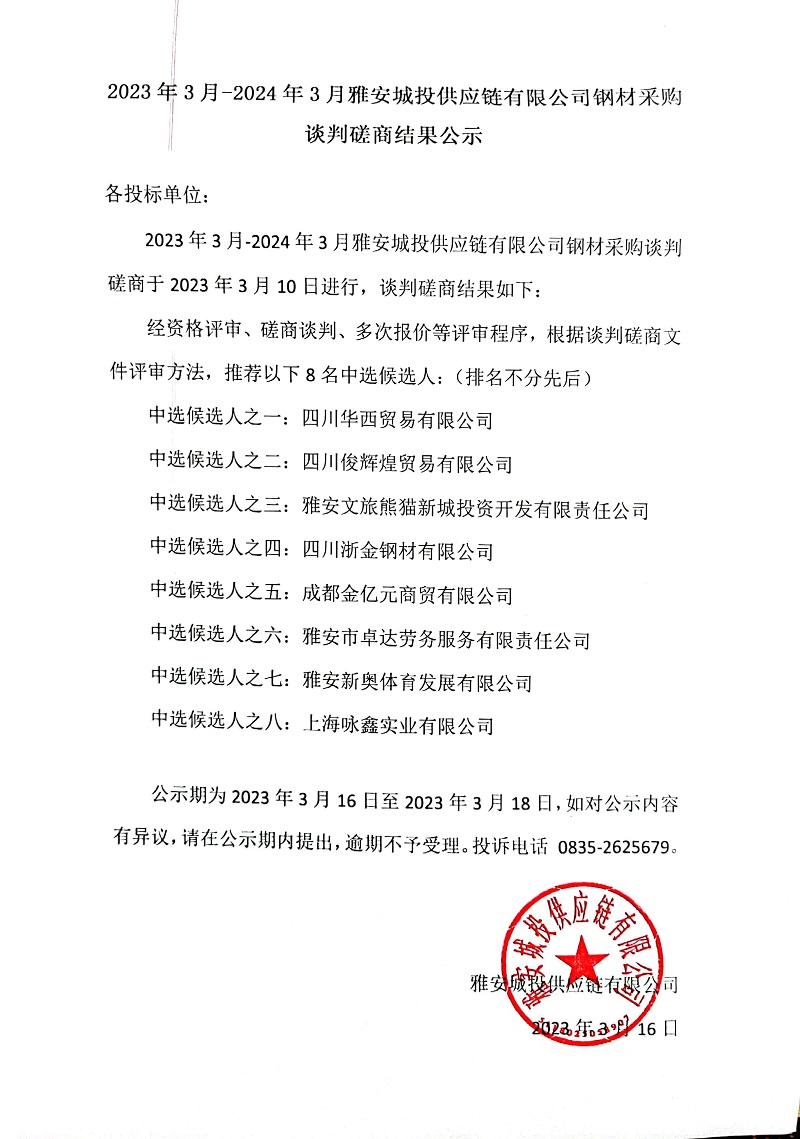 2023年3月-2024年3月雅安城投供應(yīng)鏈有限公司鋼材采購談判磋商結(jié)果公示