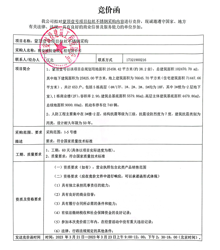 蒙頂壹號項目拉絲不銹鋼采購競價公告