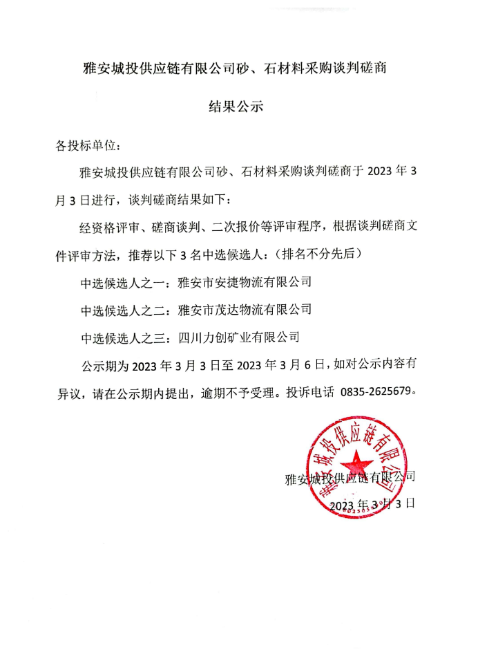 雅安城投供應(yīng)鏈有限公司砂、石材料采購(gòu)談判磋商結(jié)果公示