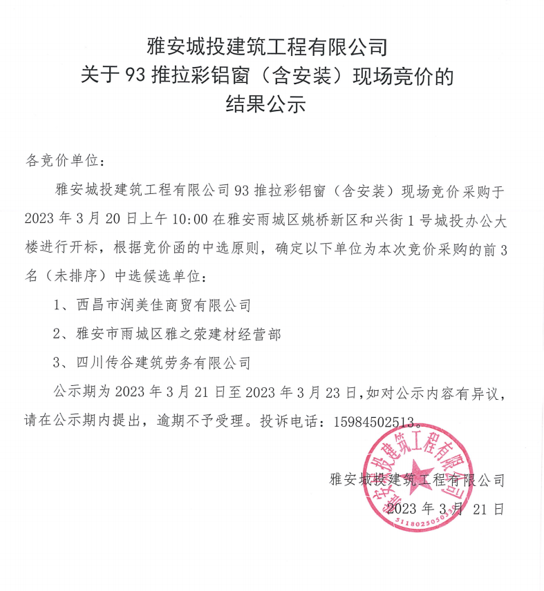 雅安城投建筑工程有限公司關(guān)于93推拉彩鋁窗(含安裝)現(xiàn)場競價的結(jié)果公示