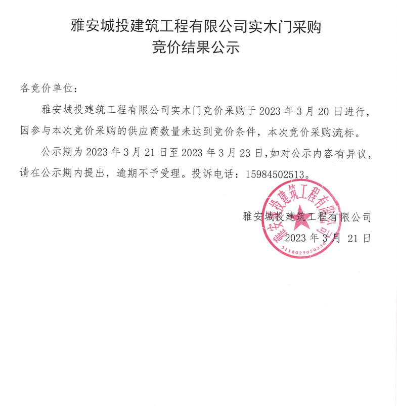 雅安城投建筑工程有限公司實木門采購競價結(jié)果公示