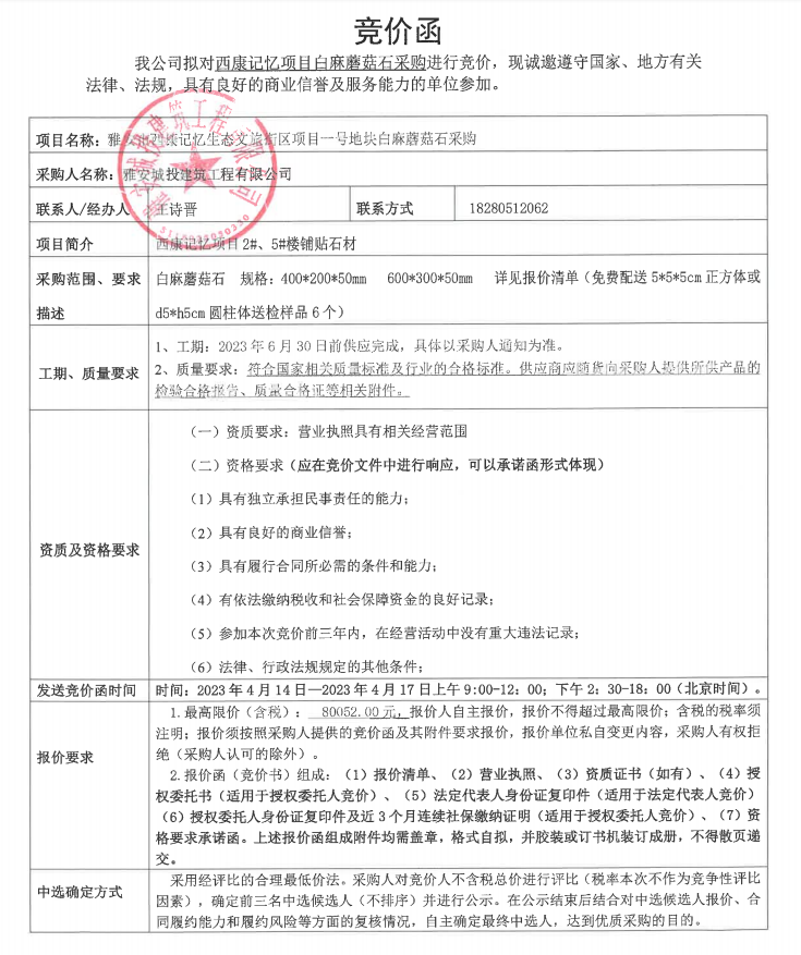 雅安市西康記憶生態(tài)文旅街區(qū)項(xiàng)目一號(hào)地塊白麻蘑菇石競(jìng)價(jià)采購(gòu)公告
