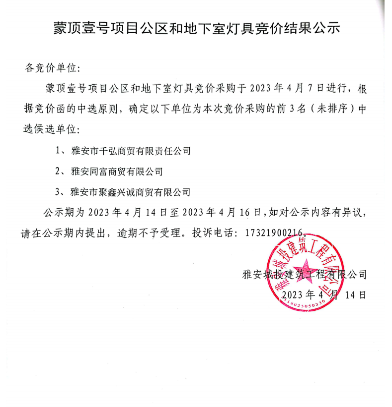 蒙頂壹號(hào)項(xiàng)目公區(qū)和地下室燈具競(jìng)價(jià)結(jié)果公示