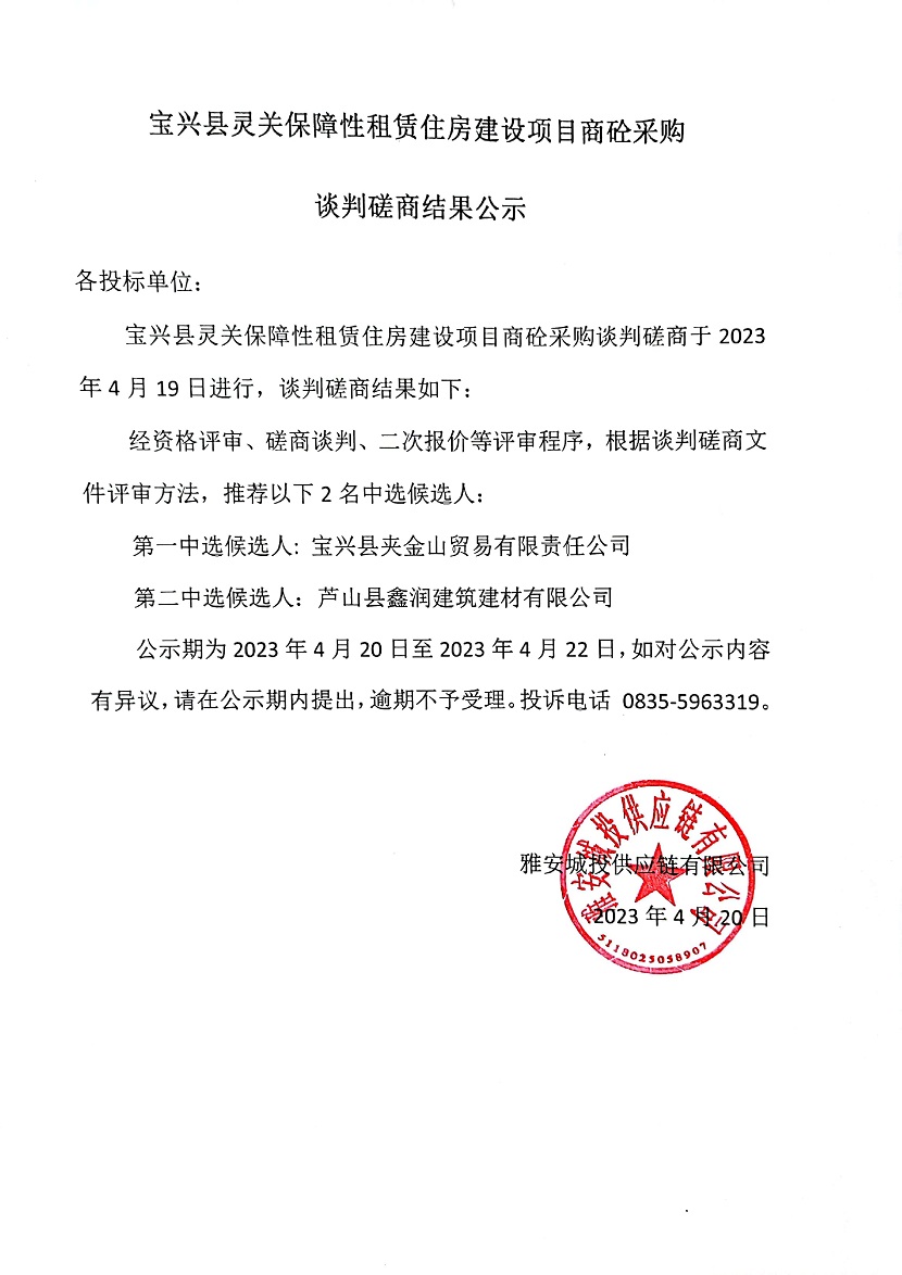 寶興縣靈關(guān)保障性租賃住房建設(shè)項目商砼采購談判磋商結(jié)果公示