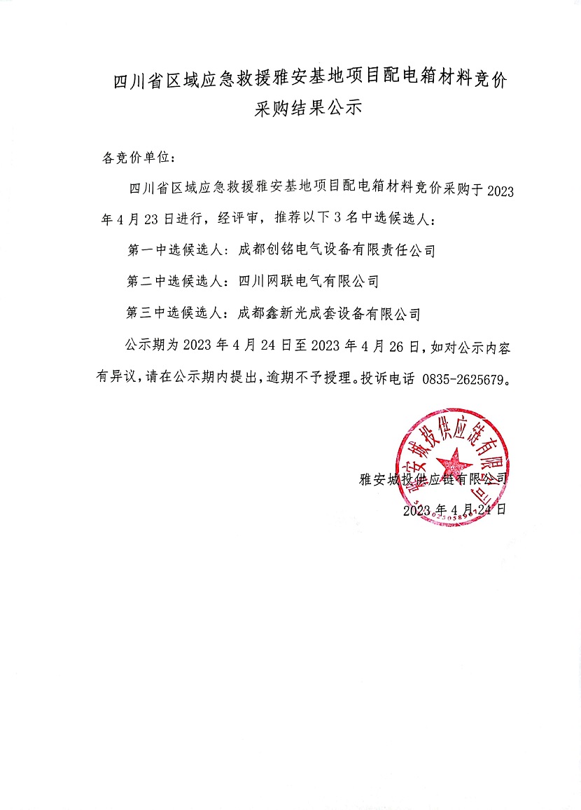 四川省區(qū)域應急救援雅安基地項目配電箱材料競價采購結果公示