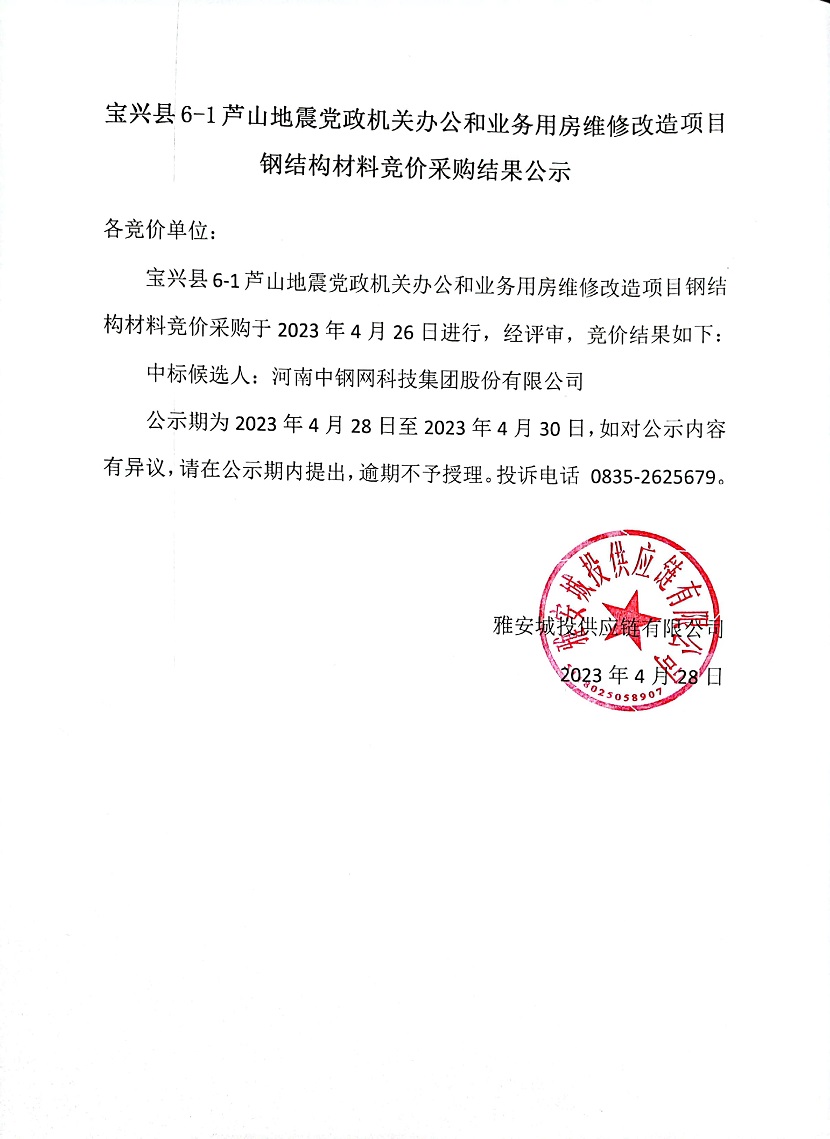 寶興縣6-1蘆山地震黨政機(jī)關(guān)辦公和業(yè)務(wù)用房維修改造項(xiàng)目鋼結(jié)構(gòu)材料競(jìng)價(jià)采購結(jié)果公示