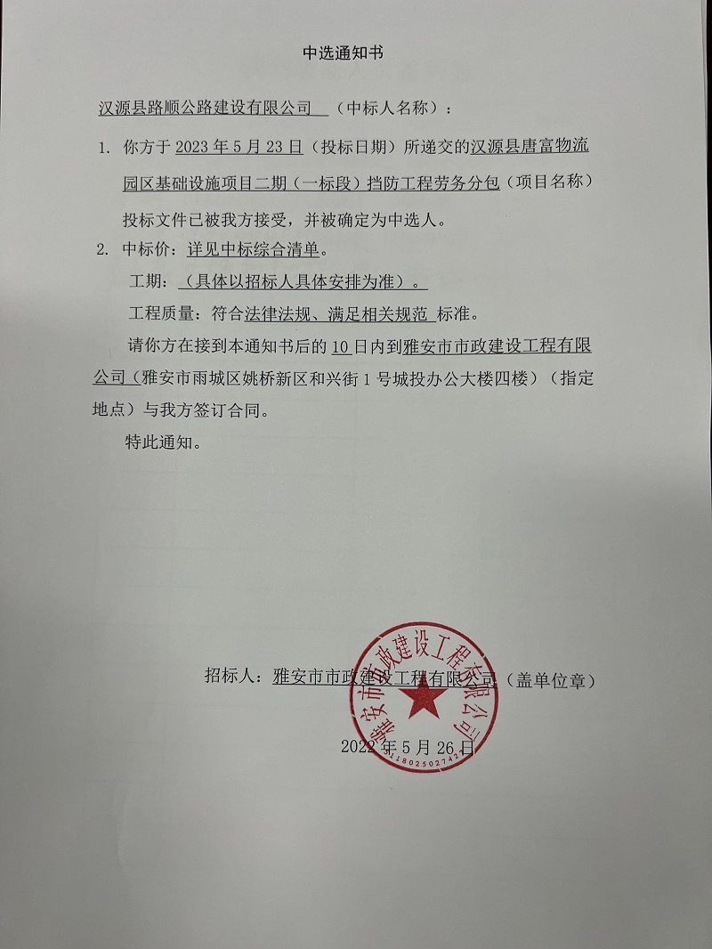 漢源縣唐富物流園區(qū)基礎(chǔ)設(shè)施項(xiàng)目二期(一標(biāo)段)擋防工程勞務(wù)分包中選通知書