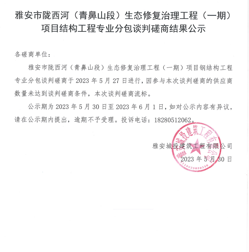 雅安市隴西河(青鼻山段)生態(tài)修復治理工程(一期)項目鋼結構工程專業(yè)分包談判磋商結果公示