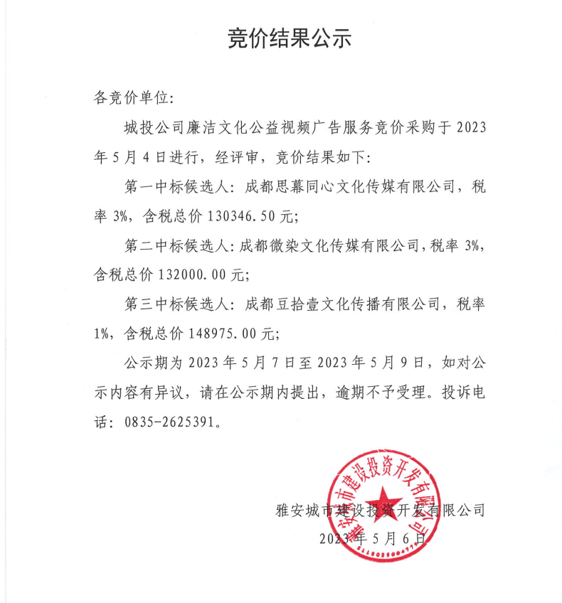 城投公司廉潔文化公益視頻廣告服務(wù)競價(jià)結(jié)果公示