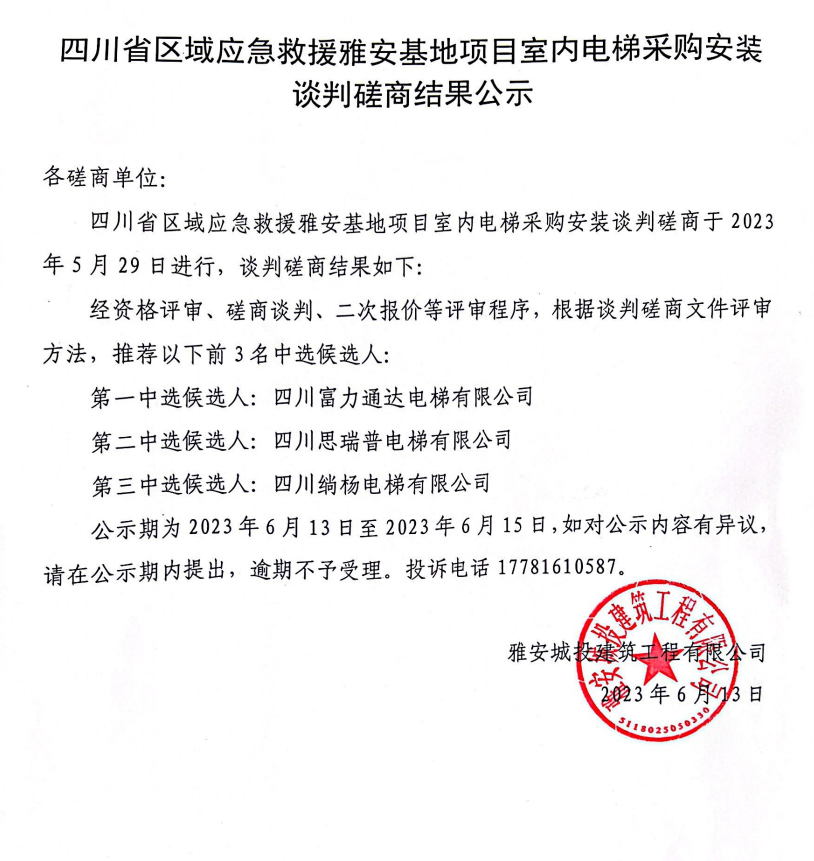 四川省區(qū)域應(yīng)急救援雅安基地項(xiàng)目室內(nèi)電梯采購安裝談判磋商結(jié)果公示