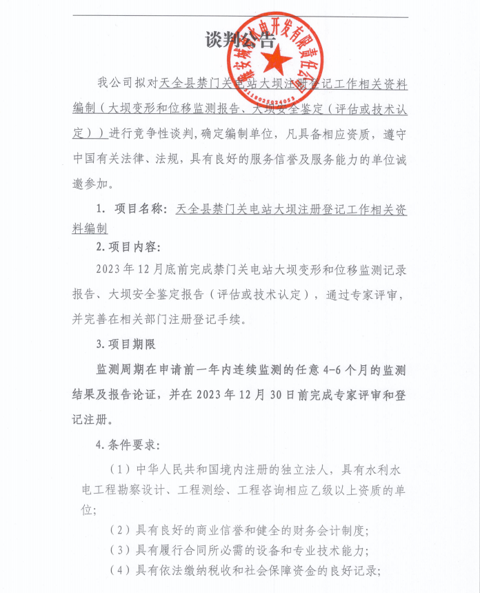 天全縣禁門關(guān)電站大壩注冊(cè)登記工作相關(guān)資料編制(大壩變形和位移監(jiān)測(cè)報(bào)告、大壩安全鑒定(評(píng)估或技術(shù)認(rèn)定))談判公告