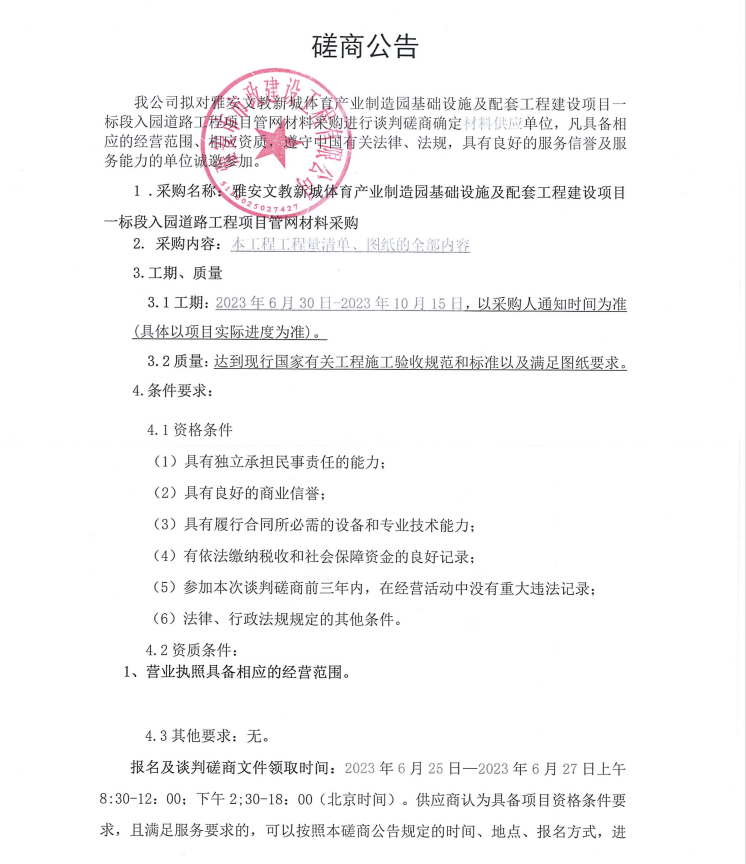 雅安文教新城體育產(chǎn)業(yè)制造園基礎(chǔ)設(shè)施及配套工程建設(shè)項目一標(biāo)段入園道路工程項目管網(wǎng)材料采購談判磋商公告
